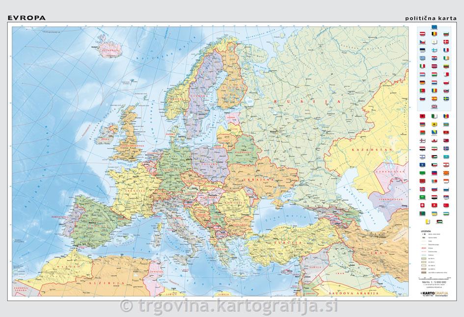 Evropa - stenski politični zemljevid Evropa izrazitih barv s poudarjenimi državami.