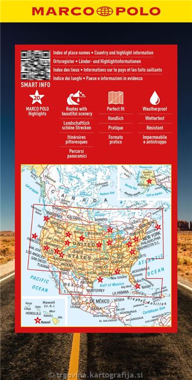 Avtokarta ZDA v merilu 1:4.200.000. Ob poti so svetovno znane destinacije, kot so Grand Canyon, Kip svobode v New Yorku, Bela hiša v Washingtonu, D.C. in most Golden Gate v San Franciscu.