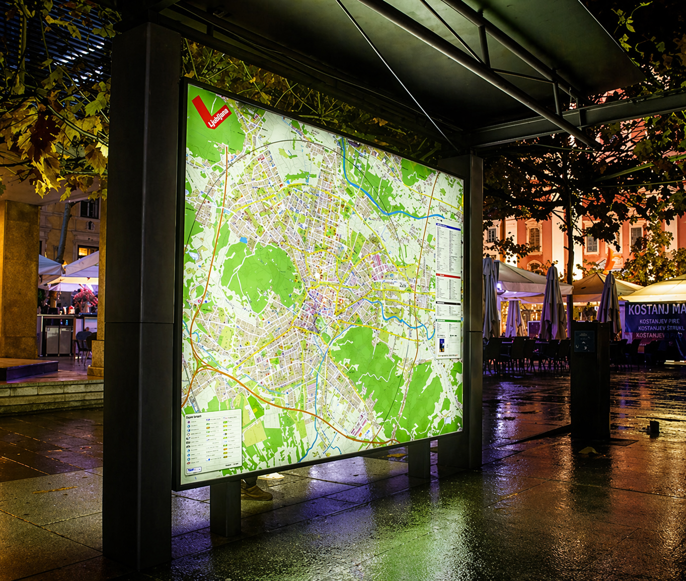 LED osvetlitvijo, ki omogoča osvetljen prikaz tudi ponoči. Rešitev je idealna za turistične točke, učne poti, parke, občine, podjetja in vse, ki želijo informacije predstaviti pregledno, trajno in estetsko dovršeno.
